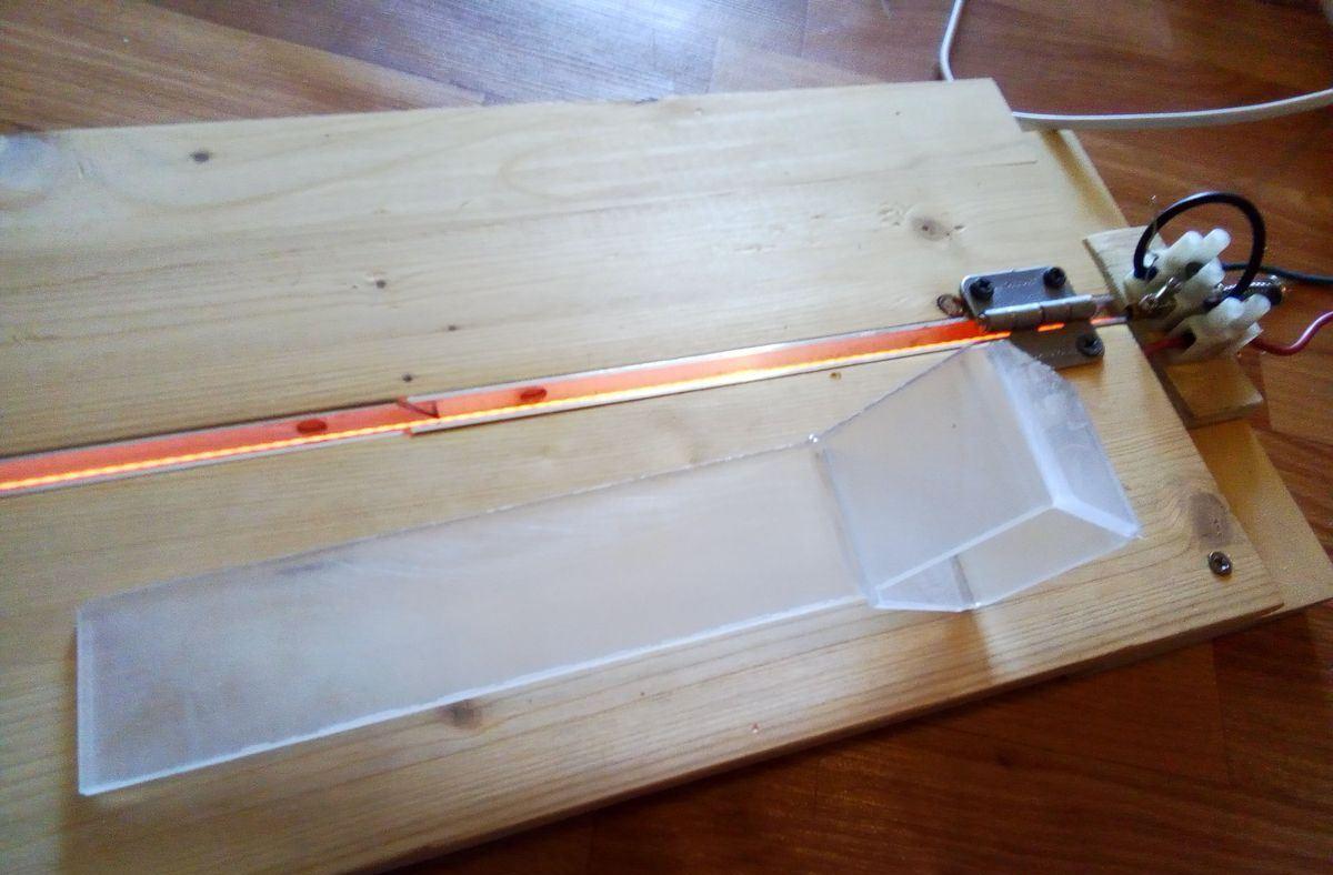 - Когда нихромовая проволока накалится, её тепло передастся органическому стеклу. В свою очередь, прогретый материал в линии сгиба начнёт прогибаться под собственным весом. В этом случае, чтобы предотвратить возможный перегиб в большую сторону, подложите со сгибаемой стороны оргстекла ограничитель в виде бруса или другой упорной поверхности. Согнутое стекло примет заданный угол.