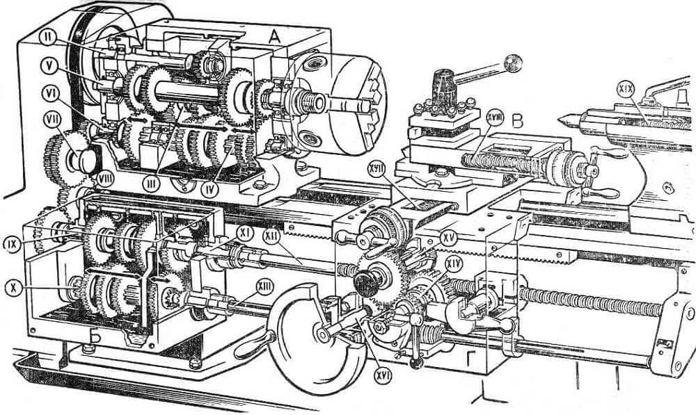 Внутрь передней бабки токарного станка ТВ 6 помещена 6-ти ступенчатая коробка передач, которую через клиноременную передачу вращает электродвигатель (главный привод). Коробка передач приводит во вращение шпиндель, в патроне которого закреплена обрабатываемая заготовка. Шпиндель опирается на три подшипника, один из которых – радиального типа, два других – упорные, и фиксируется при помощи винтов. Ниже коробки стоит подключенная к ней гитара. Этот зубчатый механизм передает вращательное движение от коробки передач на коробку подач. Его передаточное отношение имеет для токарного станка ТВ 6 постоянную величину, равную ¼.