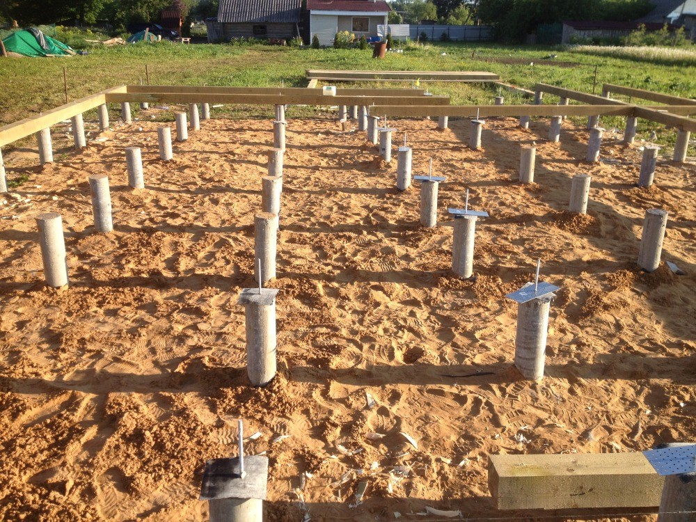 Первые четыре буронабивные сваи устанавливаются по углам, остальные должны быть равномерно распределены под несущими стенками. В местах, где будут делаться скважины, забиваются колышки.