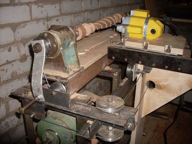Фрезерную машину можно установить как на стационарный токарный станок, так и на настольный и даже на ножной. Как сделать самому токарный станок по дереву с функцией фрезерования, если фрезера нет в наличии? Ответ прост: использовать в этом качестве электродрель. Конечно, у нее скорость вращения недостаточна для качественной обработки, но для черновой будет в самый раз. Причем можно использовать как фрезы, так и сверла. Сделанный своими руками токарно-фрезерный станок по дереву серьезно расширит возможности домашнего мастера.