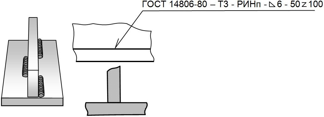 В четвертом примере шов тавровый, не имеет скосы или кромки. Он прерывистый и выполнен двусторонним методом. Шов как бы в шахматном порядке. Работа выполнена с помощь РДС в среде газа и с использованием неплавящегося металлического стержня. Катет шва равен 6 миллиметров, а длина шва составляет 50 миллиметров, с шагом в 100 миллиметров (обозначается буквой «Z»). t ш — это протяженность шва, а t пр — протяженность шага прерывистого соединения.