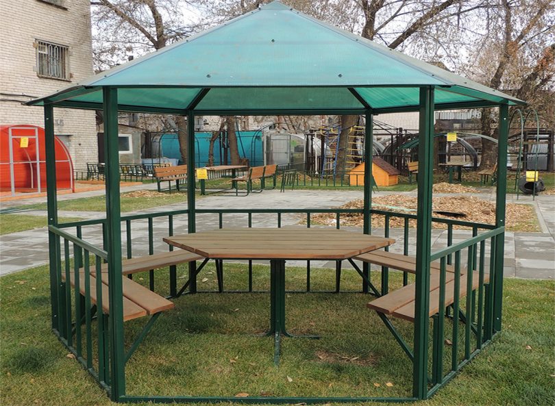 - высокая прочность (крепкий каркас металлической беседки выдерживает механические нагрузки, не деформируется при проседании грунта);