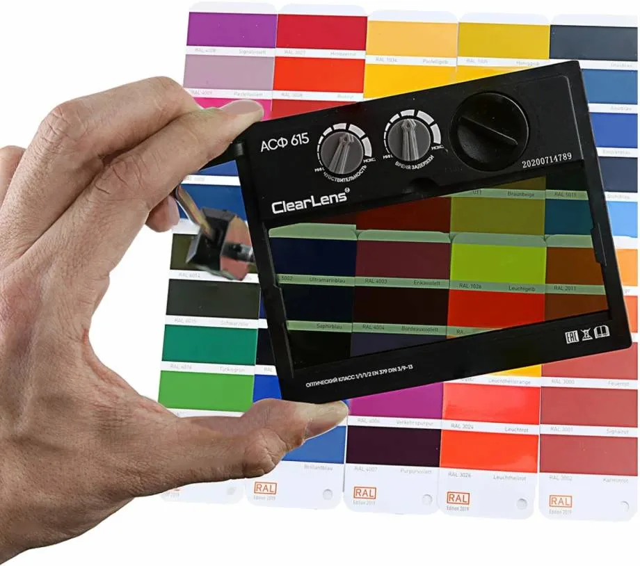 - Жидкокристаллический многослойный светофильтр с функцией автоматической регулировки уровня затемнения, в зависимости от интенсивности работ.