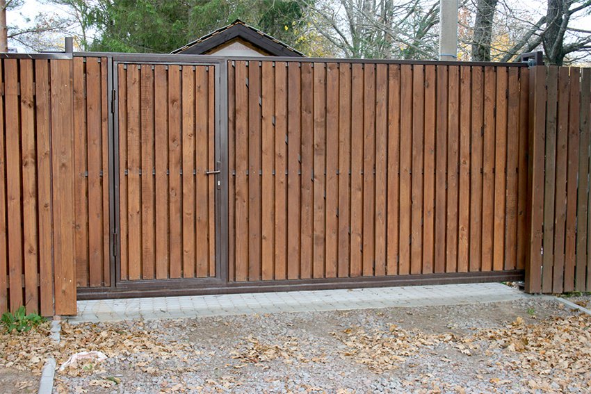 При желании можно сделать и установить откатные ворота своими руками. Многие устанавливают в створке калитку. Чтобы не тратить время на создание всех элементов конструкции, можно приобрести набор для ворот.