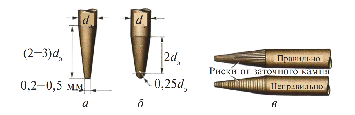 Рис. 6. Формы заточки конца вольфрамового электрода для сварки: а – на постоянном токе; б – на переменном токе; в – расположение рисок