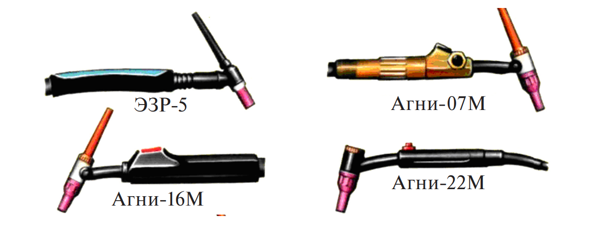 Головка горелки типа «Агни» может поворачиваться вокруг продольной оси рукоятки на угол ±180°. У некоторых моделей головка поворачивается относительно поперечной оси на угол 110° в удобное положение. Горелки с уменьшенной высотой головки предназначены для сварки в стесненных условиях.
