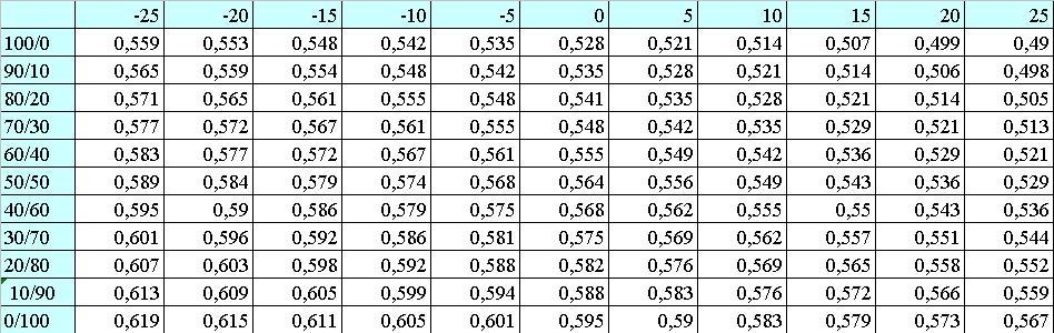 В верхней строке приведена температура окружающего воздуха (в о С), в левом столбце – процентное соотношение пропан-бутан (то есть, «90/10» означает, что смесь содержит 90% пропана и 10% бутана). На пересечении значений соотношения и температуры находится плотность смеси.